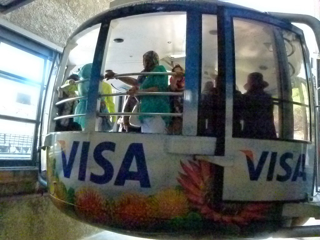 Adalbert w tych zawodach już na początku miał szansę na dojście do szczytu szybciej niż dojechanie, gdyż nie było żadnej kolejki do szlaku, za to kolejka do kolejki była na 40 minut czekania. No nic to, zobaczymy ! Gondola na szczyt ma pewnego rodzaju zaletę budującą demokrację wśród turystów. Podłoga kręci się wokół własnej osi i niemal wszyscy mają zapewniony widok na wszystkie strony. Dodam, że ci wszyscy, którzy rozumieli zasadę. Życie zrządziło, że do gondoli wepchnięto mnie z kołem gospodyń wiejskich z Radżastanu. Te drobne i urocze panie zaczęły wstawiać parasole i kijki do trybów podłogi, oby tylko pozostać na swoim ( najlepszym) miejscu przy oknie, które zdobyły szarżując linie obronne innych turystów z Europy i USA. A tu nic – parasol się złamał, a podłoga kręci się nadal. Piszę te słowa, gdyż ciągle mam przed oczyma bezsensowną dyskusję o Polakach, jako największym wstydzie innego Polaka zagranicą. Ludzie są głupi i mądrzy i często wymieniają się tymi wartościami 🙂